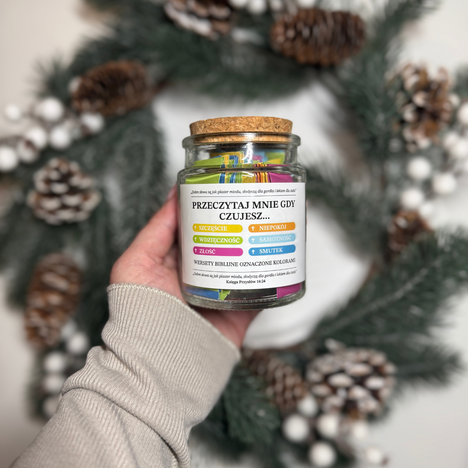 Odkryj piękno Pisma Świętego w zupełnie nowej formie. Nasz ręcznie robiony słoik zawiera 96 unikalnych, kolorowych wersetów na każdą emocję, pomagając Ci pogłębić relację z Bogiem. To idealny towarzysz porannej kawy i wieczornej modlitwy.